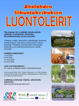Savonlinnan Seudun Liikunta ry järjestää neljä kappaletta kahden päivän mittaisia luontoleirejä Aholahden hiihtokeskuksella syyskuu 2020. Jokainen leiri suunnitellaan erikseen kyseisen kohderyhmän mukaan. Teemoina tulisi olemaan luontoliikunta, erämiestaidot, marjastus, sienestys. Kaikille leireille kuuluisi myös erilaista liikuntatoimintaa, mm. frisbeegolfin ja erilaisten liikunnallisten tehtävien merkeissä. Leireihin kuuluu myös aamukahvit, lounas sekä iltapäivisin nuotiokahvit ja makkarat kumpanakin päivänä. Lisäksi rantasauna mahdollisuus leirin toisena päivänä. Leireillä noudatetaan koronaohjeistuksia käsienpesumahdollisuus / desinfiointimahdollisuus ja turvavälit huomioiden. Leirit ovat kahden päivän mittaisia päiväleirejä. Toimintapäivät ovat tiistai ja keskiviikko. Toiminta-aika leiripäivinä on kello 9-15. Toimintaa sisältyy liikunnallisia aktiviteettejä Aholahden hiihtokeskuksen maastoissa sekä luontoon liittyviä tehtäviä. Toimintaa liittyy kumpanakin päivänä ruokailu ja välipala iltapäivisin nuotiolla makkaraa ja lettuja paistellen. Saapuminen Aholahden liikuntakeskukseen: Aholahden liikuntakeskukseen (Naistenlahdentie 118) pääsee joko omalla autolla tai paikallisliikenteen linja-auto nro 2, jonka päätepysäkki on Naistenlahdentien alkupäässä. Sieltä on noin 1km kävelymatka liikuntakeskukselle. Mukaan tuleville on mahdollisuus saada avustusta kyytien järjestämiseen hankeen kautta. Leirin vastuuhenkilönä toimii liikunnanohjaaja Timo Reinikainen.
